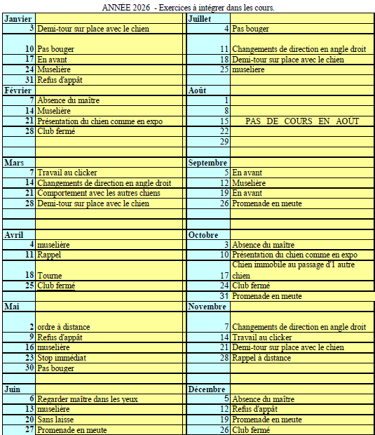 Des exercices spécifiques sont également intégrés aux cours, vous en trouverez le planning ci-dessous: